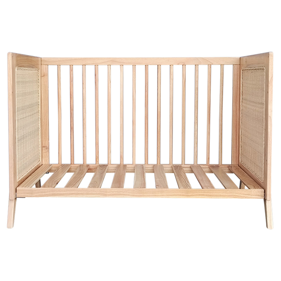 Het ledikantje heeft een in twee hoogtes verstelbare bedbodem en is ook als kleine bedbank te gebruiken wanneer één zijkant wordt verwijderd. Bijzonder aan dit ledikantje is dat de panelen zijn bekleed met prachtig, rotan vlechtwerk (100% natuurlijk).